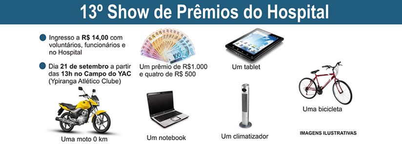 As pessoas que desejam participar do 13º Show de Prêmios do Hospital devem comprar uma cartela, que custa R$ 14,00 na portaria da instituição, da divisão do carnê, com funcionários e voluntários.